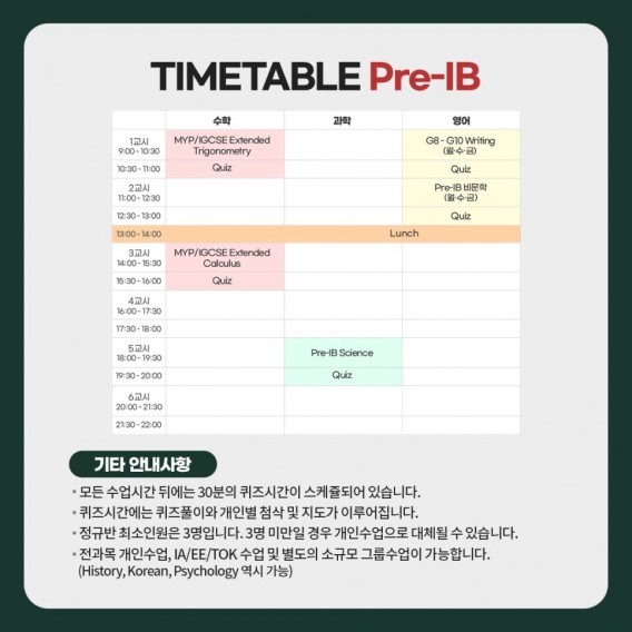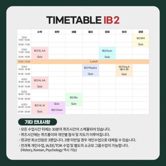 학생 일정에 따라 각 과목 2주, 3주, 또는 4주 등록이 가능하며
